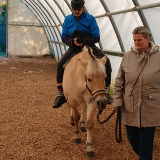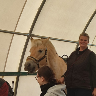 Dort erwartete uns Sara Vos mit ihrem Ehemann und die norwegische Fjordpferdestute Gaudi. Etwa eine halbe Stunde durfte jeder von uns „aufsitzen“ und sich an den beiden Griffen auf dem Pferderücken festhalten. Wenn das geschafft war, ging es im Schritttempo geführt durch die Halle. Nach 2-3 Runden in der Halle durften alle noch ein paar Runden an der frischen Luft auf dem Außengelände bei Sonnenschein drehen. Was war das doch schön!
